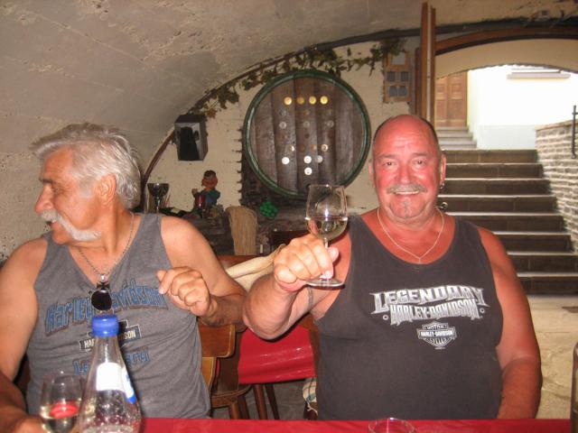 Aus der jahrzehntelangen Erfahrung von Harley & Wein fahren wir vor der Unterkunftseinnahme, welche stets über den Weinkeller erfolgt, erst einmal rauf in die Waldschenke in Ürzig und lassen uns von Eckhard, Ria und Monika die legendären Rindsrouladen servieren, um so eine vernünftige Grundlage für die Herausforderungen des Freitags zu haben. Wie erwähnt, findet die Zimmereinnahme und das RULAMAN Banner hissen im bzw. während der „Besichtigung“ -Haha- des Weinkellers statt, wobei dann auch die noch später eintreffenden Kameraden(innen) des Rhein-Ruhr Chapters, Rhein-Neckar Chapters, als auch die belgischen Freunde mit den gleichen Ritualen empfangen werden. Gegen 18.00 Uhr geht’s dann runter auf das Eventgelände zum Eintragen in die Teilnehmerlisten, den Pin kaufen, welcher auch zur Teilnahme an der „Wein Aufwiegung“ berechtigt, und zur ersten Inaugenscheinnahme der Stände.