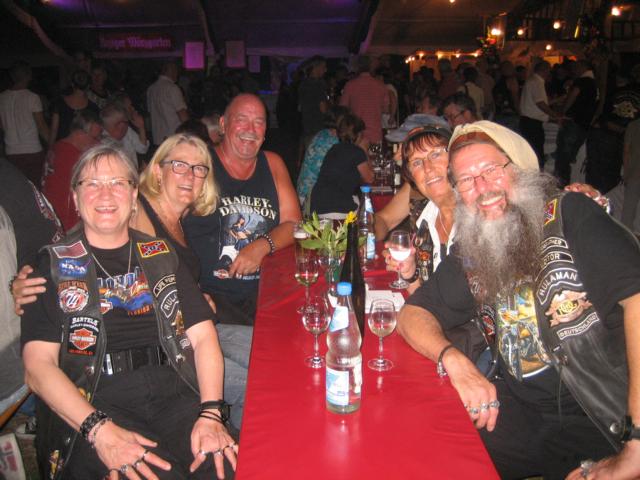 In dem Festzelt, welches aus allen Nähten platze und temperaturmäßig eher einer Sauna glich, wurde dann die Weinkönigin mit ihren Weinprinzessinnen auf Harley´s reingefahren und dem Publikum vorgestellt. Das Weinaufwiegen des diesjährigen Pin Los Gewinners, fiel aus technischen Gründen aus. Es wurden stattdessen 3 Lose für eine verschiedene größere Menge Wein gezogen. Da wir von diesem Getränk in den letzten Tagen genug konsumiert hatten, herrschte an unserem Tisch die Meinung vor, … man muss auch gönnen, können…(rheinisch: me mos och jünne, künne) und überließen anderen Teilnehmern die 66 Weinflaschen!