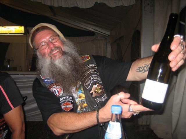 In diesem Jahr waren wieder verschiedene freie Händler mit vielen Accessoires für Maschine und Lenker(in), der „Schaltstangen“ Alfons, der HD Händler aus Trier-Konz und erstmalig die German HOG Charity mit unserem Chief Heinz, vor Ort und rundeten den Event Zeltbereich mit Schieß-, Flammkuchen-, Mandeln-, Currywurstbuden, Wein- und Bierstände (?) ab. Um 18.30 Uhr beginnt die offene Weinprobe mit der Verkostung von 100 Sorten Riesling Weine der Region Ürziger Würzgarten und verlangt den Teilnehmern schon ein gewisses „Standvermögen“ ab. Die musikalische Unterhaltung wurde am Freitag von der Band „Handpicked“ bestritten, deren Programm als sehr gut zu bezeichnen war. Zwischen durch trat als Special Guest Michael Müller, laut Programm ein Biker Kabarettist auf, aber selbst nach mehrmaligem Nachfragen am Samstagmorgen beim Frühstück konnte sich definitiv keiner an das Repertoire erinnern, da die Pointen irgendwie im Lärm des komplett gefüllten Festzeltes „untergingen“.