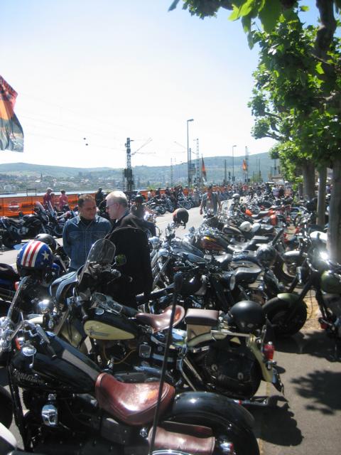 Donnerstagmorgen 09.30 Uhr „blauester Himmel“ schon 17 Grad plus, trocken, also ab mit der Roadkingclassic auf die B 42 Richtung Rüdesheim. Auf der Fahrt dorthin mussten wir erkennen, dass diese Idee schon andere HD Fahrer gehabt hatten, da sich schon zu diesem Zeitpunkt HD Konvois zwangsläufig bildeten.