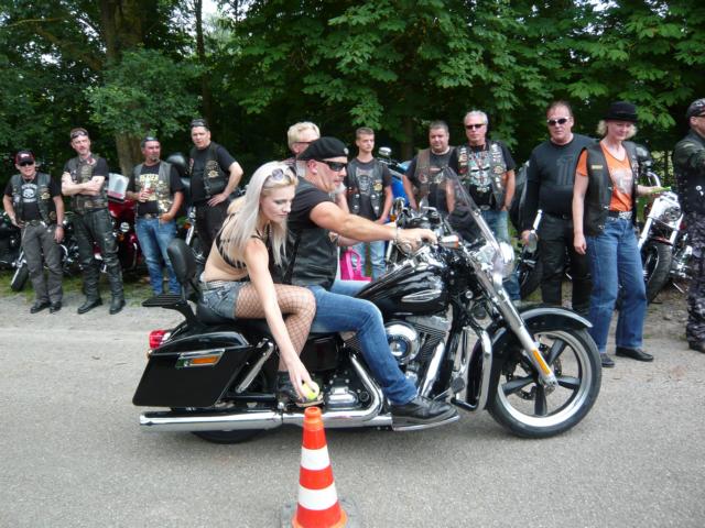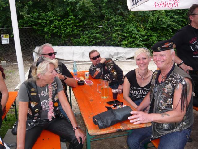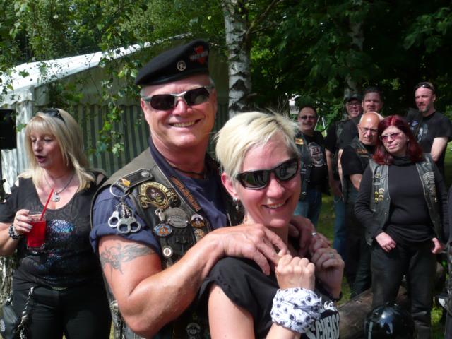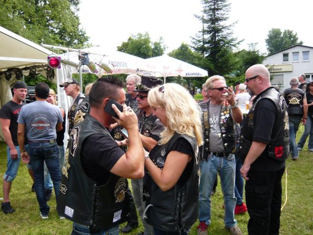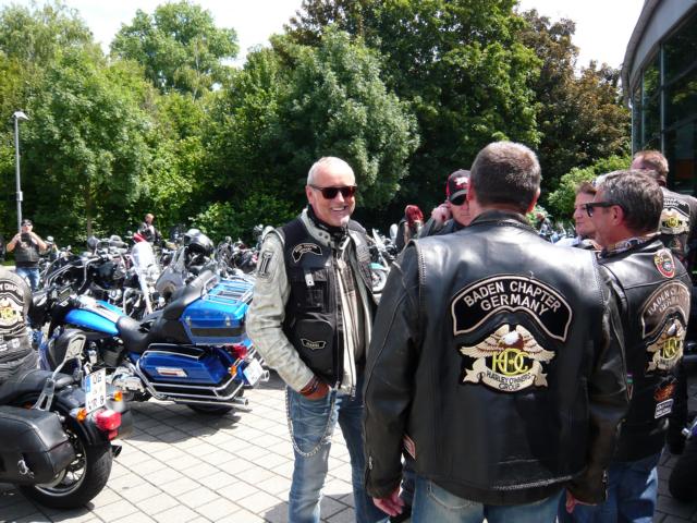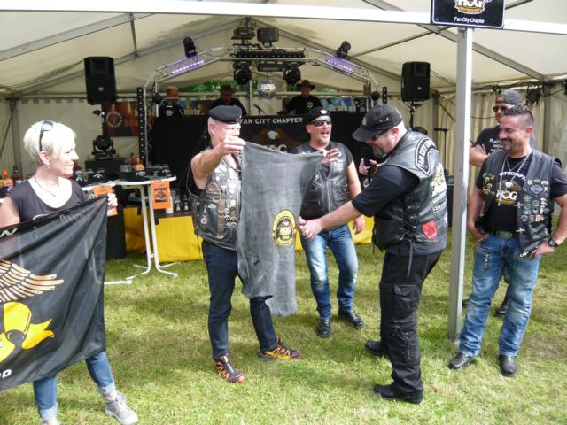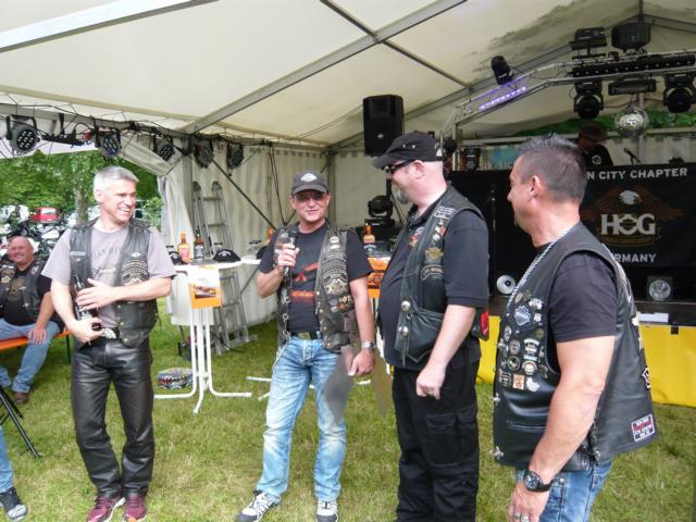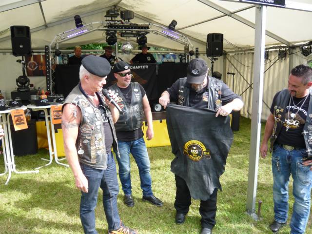 Mit Unterstützung der RC`s des FCC ging es mit ca. 30 Bikes zum Eventgelände. Das Wetter passte, die Freunde warteten bereits und nach einer kurzen Eröffnungsrede fing die Party mit Biker-Spielen und viel Spaß an. Durch das Programm führte unser alter Freund Reinhard vom FCC. Nach Übergabe unseres Geschenks an Ralf, Director des FCC bekam ich zur Antwort, dass das Geschenk einen Ehrenplatz einnehmen werde. Nach und nach trafen die befreundeten Chapter des Rhein-Valley, Rhein-Mosel und die Schwaben auf dem Gelände ein.