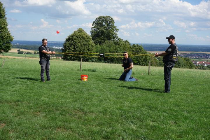 Ziel ist es, die gegnerische Partei mit den Wasserbomben, d.h. mit Wasser gefüllten Luftballons richtig nass zu machen. Nach anfänglichen Treffern, die irgendwo im Wald und auf der Wiese landeten, kamen die Einschläge näher. Irgendwann schaffte es das Herz Ass Chapter einen Treffer zu landen und somit das Duell für sich zu entscheiden.
