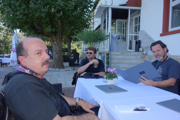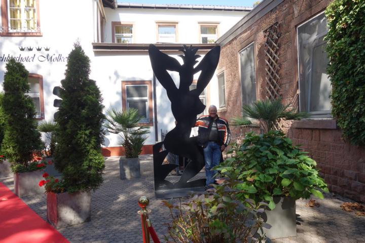In Heidelberg angekommen, machten wir uns auf die Suche nach dem Restaurant, bei dem Burghardt das Mittagessen organisiert hatte. Nach kurzer Diskussion mit einem Ordner, der uns nicht auf die Zufahrtsstraße zum Schloss lassen wollte von dem aus wir das Restaurant erreichen konnten, fuhren wir am Heidelberger Schloss vorbei zum Schlosshotel Molkenkur. Dort lag schon der rote Teppich ausgerollt – wahrscheinlich nur für uns.