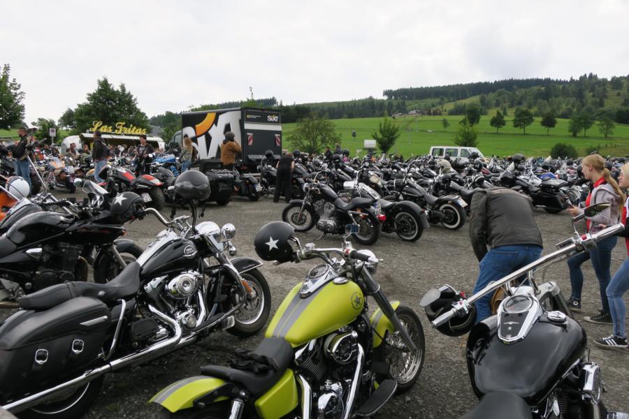 Die Anfahrt von knapp 240 km (querfeldein), durch die ländlich, bäuerlich geprägte Landschaft, mit „Tausend Hügeln und ebenso vielen Kurven“, bezeichnet als Sauerland, hatte in diesem Jahr aber ein paar Überraschungen parat. Zum einen gab es eine Vielzahl von Baustellen, Umleitungen und schadhafte Straßenabschnitte zu bestaunen, als Highlight ist eine Umleitung auf einer Kreisstraße zu bezeichnen, die ohne jedwede Alternative oder Warnung plötzlich in „einer Sackgasse“ endete; also wieder zurück und ein neuer Anlauf begann. Die Polizei des Landes Hessen wollte offenbar auch noch einen Betrag der besonderen Art für die Veranstaltung beisteuern, hatte diese doch eine Kontrollstelle eingerichtet, wo unter anderem eine Phonmessung vorgenommen wurde. Wir wurden nicht angehalten, zum einen ist alles eingetragen und zum anderen war die Kontrollstelle noch nicht fertig; andere Chapterfreunde verbrachten dort einen längeren, teilweise erfolglosen Aufenthalt.