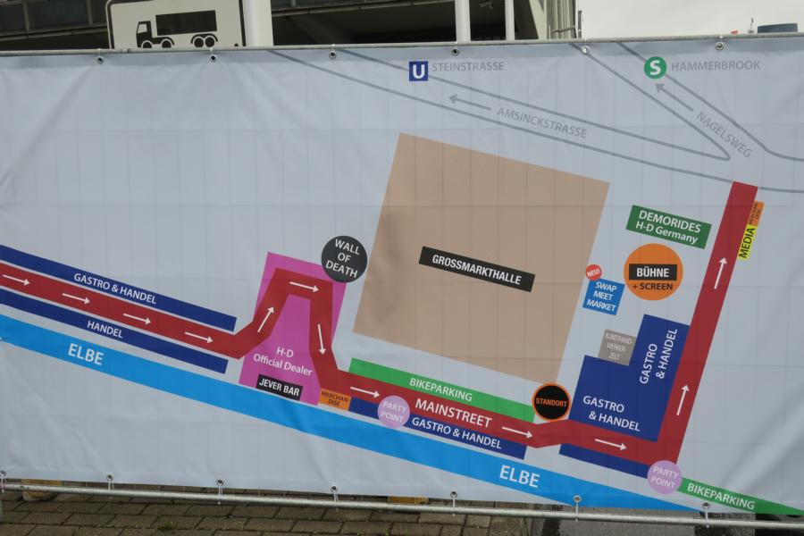 In Hamburg selbst war es am Freitagvormittag bis auf einen kurzen Schauer noch trocken, dafür aber Wind bis Sturmstärke 8, was den Aufenthalt auf dem Eventgelände Großmarkthallen im offenen Hafenbereich auch nicht gerade angenehm gestaltete.(siehe hier auch Bild der „gesicherten Mainstage durch notwendige Spanngurte“) Wir hatten im Vorfeld schon erfahren, dass aufgrund des schlechten Wetters der letzten beiden Jahre, verschiedene Händler in diesem Jahr nicht teilnehmen würden, was sich auch in den doch optisch großen Lücken niederschlug. Im Bereich Eingang Lippertstraße ist die dritte Musikbühne ebenfalls weggefallen, es waren nur noch die Jever Bühne und die Mainstage vorhanden. Im Bereich der Mainstage hatte man erstmalige vom Team 412 (richtig, das ist die Mannschaft die in Faak ein riesiges Zelt bewirtschaftet) ein 200 Personen Zelt errichtet?!