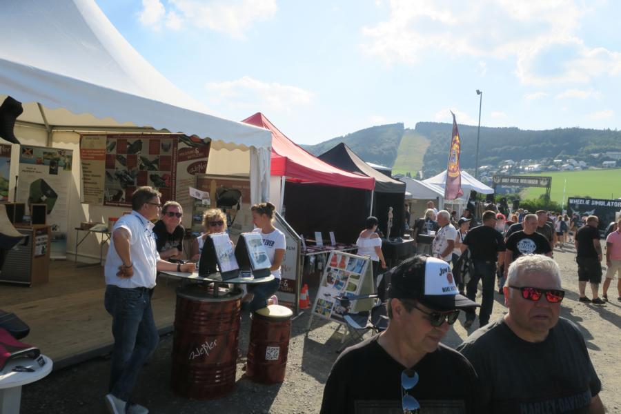 Auf dem Eventgelände waren insgesamt ca. 100 Händler, von der „Futterkrippe in verschiedenen Versionen von amerikanisch, asiatisch bis süß“, Warsteiner Bierstände, Willinger Brauhaus, ein stark besuchter Weinstand, JD, Jim Beam und Jägermeister Bar, bis hin zu den acht HD Händler aus Hagen, Remscheid, Bochum, Bielefeld, Osnabrück, D-dorf, (das muss in der Nähe von Köln sein), Kassel und Kamen zzgl. der großen Anzahl von freien Händler, sowie verschiedenen Veredlern, vor Ort. (siehe Bilder)
