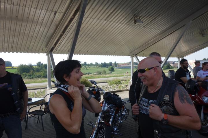 Pünktlich zum vereinbarten Zeitpunkt trafen wir bei Georgs Fischerhütte auf der Insel Reichenau ein. Diese lag direkt am Bodensee. Manch einer spielte mit dem Gedanken, sich kurz im Bodensee zu erfrischen. Von den Motorradfreunden Sargans in der Schweiz kamen noch 2 Harley Fahrer, die Burghard zum gemeinsamen Mittagessen eingeladen hatte. Sie fuhren kurz mal 150 km, um bei uns dabei zu sein.