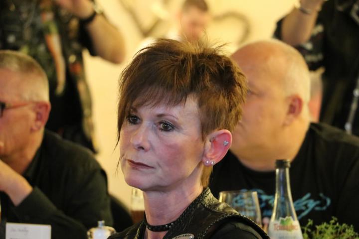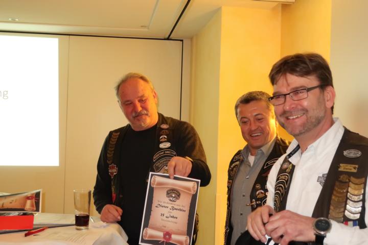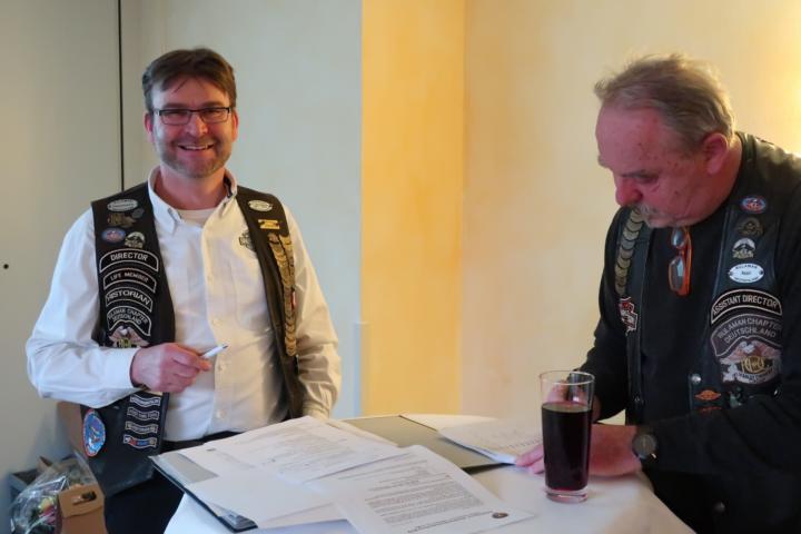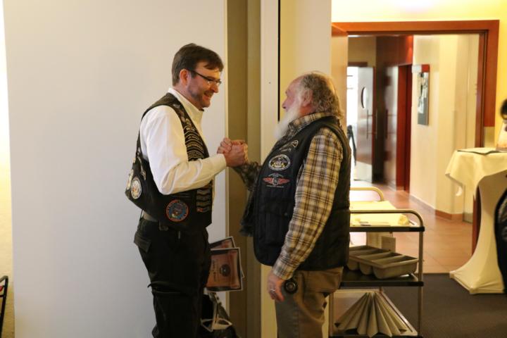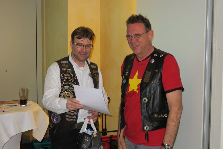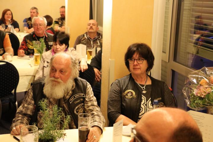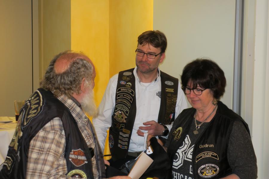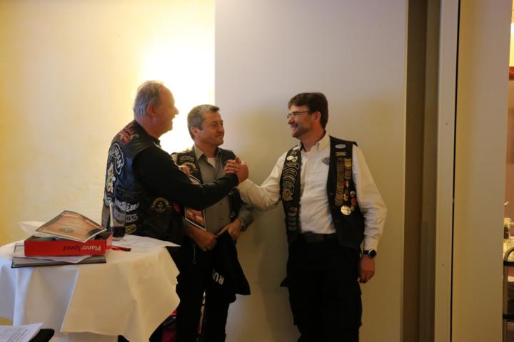 Des Weiteren wurde als Dank und Anerkennung ihrer langjährigen Tätigkeit als “unsere ehemalige Frau L.O.H.“, Gudrun Nestel, vom Director Dieter ein Blumen Ensemble überreicht, bevor dieser unserem ehemaligen, langjährigen Secretary Roland Weber I, sowie dem ehemaligen Road Captain Joel Loiseau als Dank des Chapters ein Weinpräsent aushändigte.