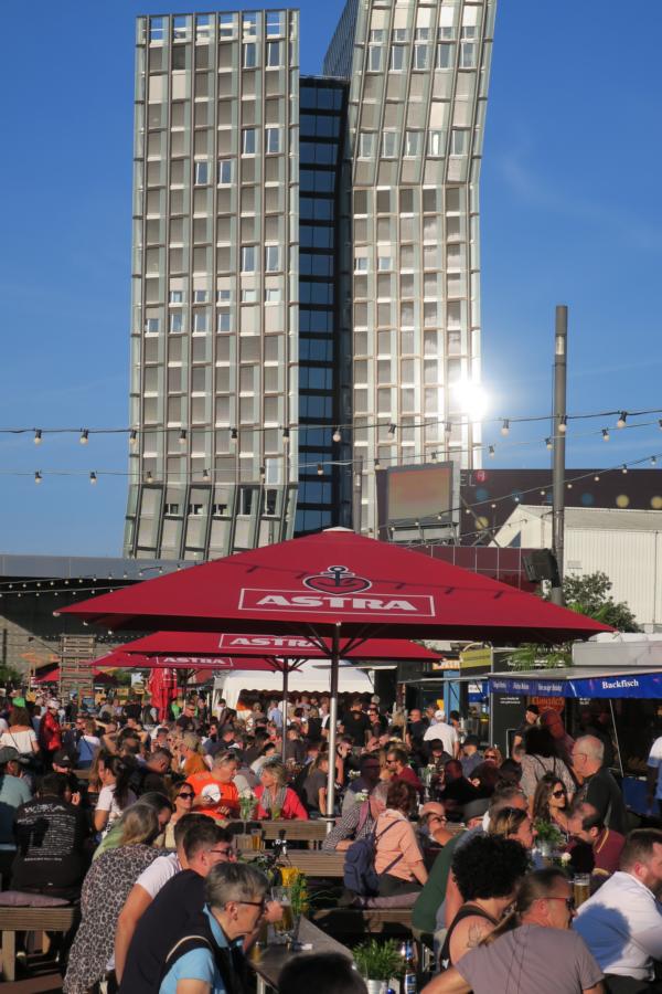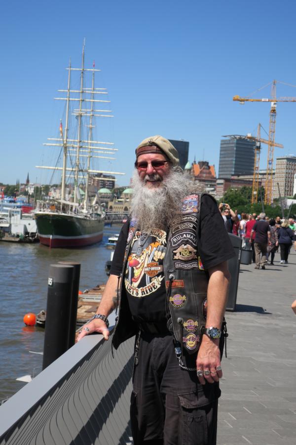 Danach erneut auf das Eventgelände und wieder zu dem Schluss gekommen, dass offenbar fast jeder Hamburger Einwohner, irgendwann oder irgendwie sich auf das Eventgelände bei kostenlosen Eintritt begibt, um „Rocker zu schauen“. Komplette Familienverbände mit Kindern aller Altersklassen, Oma. Opa, alles war vertreten und es war außer den über 34 Grad auch körperlich ein Problem, zum einen „seinen Weg“ zu gehen und zum anderen einen schattigen Platz in einer der Getränkestände oder dem Team 412 Zelt zu finden, da alles restlos überfüllt war, das Servicepersonal seine „liebe Not“ hatte der Situation gerecht zu werden und jedem seine Getränke zeitnah zu liefern. Irgendwann kommt man trotz der guten Musik, der alles im allem guten Stimmung und der damit verbundenen Gespräche zu dem Schluss „raus hier aus dieser Freiluftsauna“ und ab auf die Reeperbahn. Hier hatte sich die HVV auch ein besonderes Schmankerln ausgedacht, da die Landungsbrücken bzw. die Reeperbahn mit der U-Bahn wegen Bauarbeiten nicht zu erreichen war, man musste entweder bis Baumwall mit der U-Bahn fahren und dann den Bus nehmen oder direkt mit der S-Bahn, nach einem kurzen Fußmarsch zum Hammerbrock, die Fahrt nach St. Pauli, Station Reeperbahn, vollziehen.