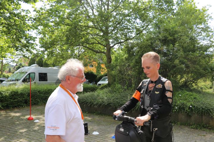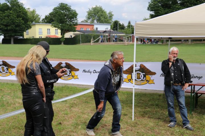 Nach der Rückkehr wartete Kaffee und Kuchen auf uns und dann ging es schon los mit den Bikerspielen. Es wurde ein Laufzettel ausgehändigt, auf dem nach jedem Spiel die Punktzahl eingetragen wurde. Damit auch unser Nachwuchs bei den Spielen teilnehmen konnte, gab es Dosenwerfen, Putten mit dem Golfball und Hufeisenwerfen und Bean Bag Toss. Eine eigene Wertung gab es für den Kurbelwellen-Weitwurf einer 8 kg schweren Kurbelwelle. Hier galt es die Technik des vor einem Werfenden zu studieren ob mit Anlauf, kreisförmiges Ausholen und Werfen … Des weiteren steuerte Horstmar Segways für einen gelungenen Nachmittag bei.