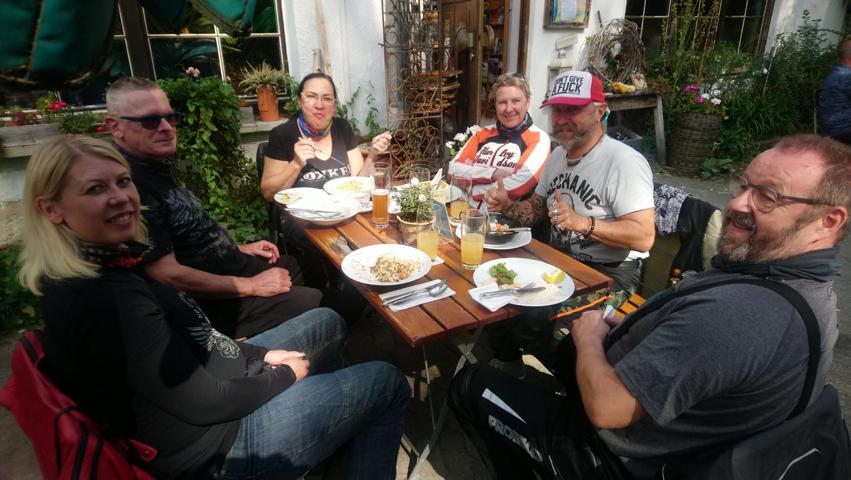 Die Strecke hatte Marko, unser Road Captain gut gewählt. Sie führte über das Lenninger Tal, Wiesensteig, Gingen an der Fils, Rechberg nach Adelberg. Dort angekommen, machten wir eine Pause und ließen uns das Essen schmecken.