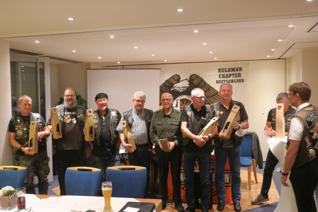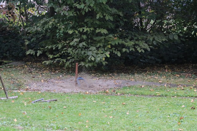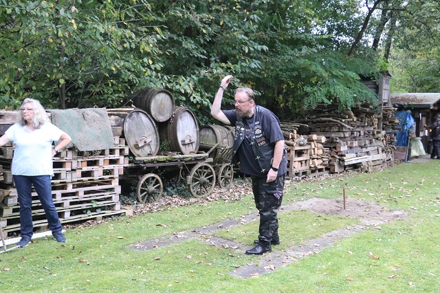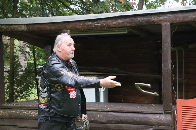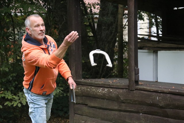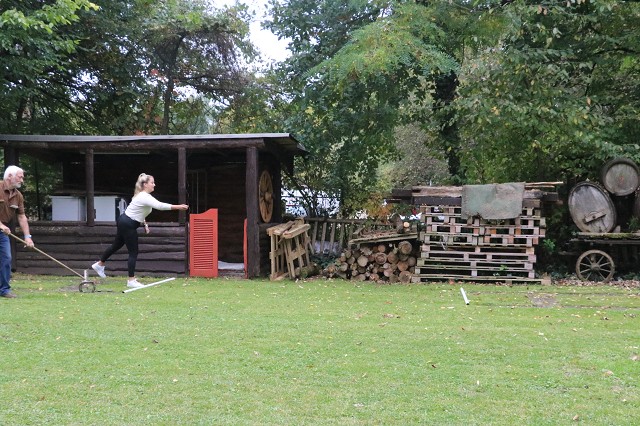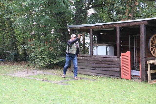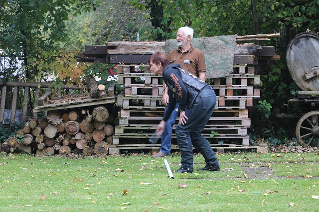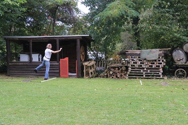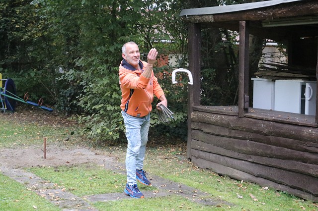 Jetzt wurde es ernst. Da wir diesen Wettbewerb nur einmal im Jahr zum 03.10. durchführen, gab es erst einmal eine Runde mit Probewürfen. Jedes Member versuchte sich daran, mit 24 Würfen eine möglichst hohe Punktzahl zu erreichen. Der Refree vom Reutlinger Countryclub zählte die Punkte zusammen und gab diese an den Schriftführer weiter. Um Punkte zu bekommen zählt der Abstand vom Stab, ob das Hufeisen Kontakt zum Stab hat oder diesen ganz umschließt.