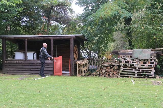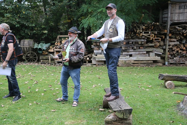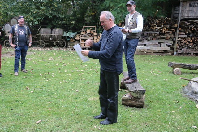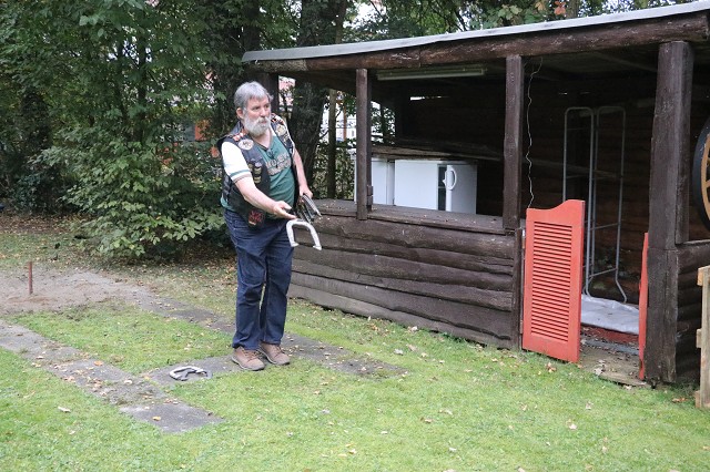 Jetzt wurde es ernst. Da wir diesen Wettbewerb nur einmal im Jahr zum 03.10. durchführen, gab es erst einmal eine Runde mit Probewürfen. Jedes Member versuchte sich daran, mit 24 Würfen eine möglichst hohe Punktzahl zu erreichen. Der Refree vom Reutlinger Countryclub zählte die Punkte zusammen und gab diese an den Schriftführer weiter. Um Punkte zu bekommen zählt der Abstand vom Stab, ob das Hufeisen Kontakt zum Stab hat oder diesen ganz umschließt.