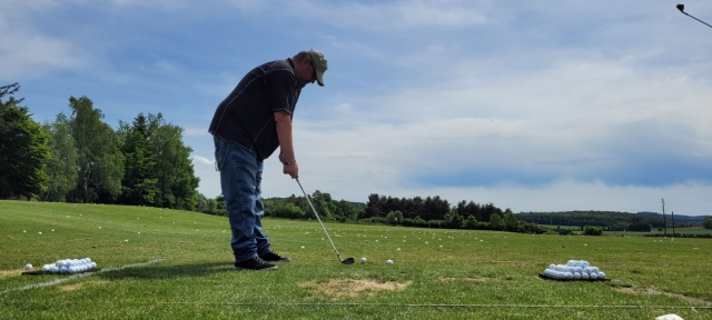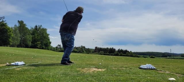 Am Golfplatz angekommen, wartete Marko und Ralph auf uns. Bei der Driving-Range übten wir Abschläge. Marko und Andreas gaben uns Hilfestellung über den richtigen Stand, die Wahl des Eisens, Körperhaltung und was sonst noch wichtig war. Man war schon froh, wenn sich der Schläger nicht in die Erde bohrte und der Ball auf der Stelle liegen blieb.