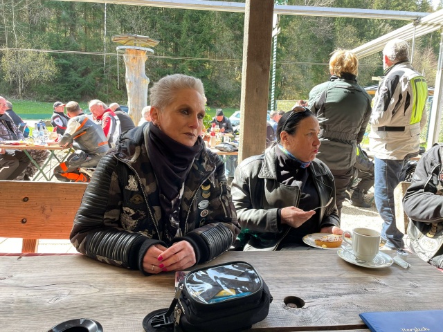Bis zu unserem ersten Stopp nach 2 Stunden führte uns Frank rund um die Nagoldtalsperre mehrmals diverse Serpentinen hoch und wieder runter ins Tal. Es war mächtig was los beim unserem Stopp "zum Seeheiner". Da ein warmes Essen mindestens eine Stunde Wartezeit in Anspruch genommen hätte, gab es stattdessen Kaffee und Kuchen. Leider gab es trotz des frischen Wetters keinen Platz in der Sonne. Das machte aber unseren wetter- und sturmerprobten Rulas nichts. Nach einer Tankpause fuhren wir weiter über Freudenstadt nach Horb am Neckar. Während der Pause musste noch "gschwind" der Spiegel des Moppes von Karl Heinz gerichtet werden.