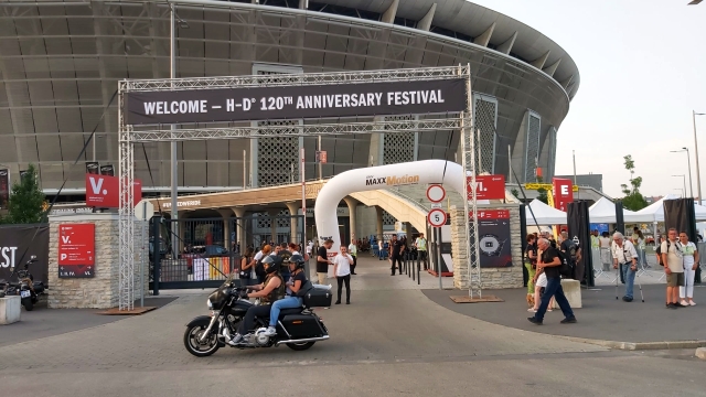 Auf dem Eventgelände vor dem Fußballstadion herrsche schon Hochbetrieb. Es gab viele Bühnen, wo unbekannte und bekannte Bands sich die Seele aus dem Leib spielten. Viele Händler machten schon guten Umsatz, da es Schlangen vor der Kasse der Verkaufszelte gab. Ein paar Biker übertrieben es etwas und einer von ihnen legte sich mitsamt seiner Road King auf den Asphalt. Diese schlitterte ca. 10 Meter über den Boden aber der Biker, der keine Schutzkleidung anhatte, schüttelte sich und stieg wieder auf sein Bike und fuhr weiter als ob nichts gewesen wäre.