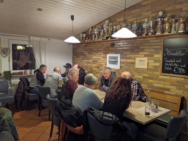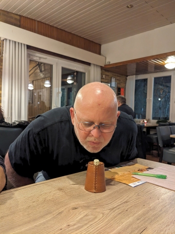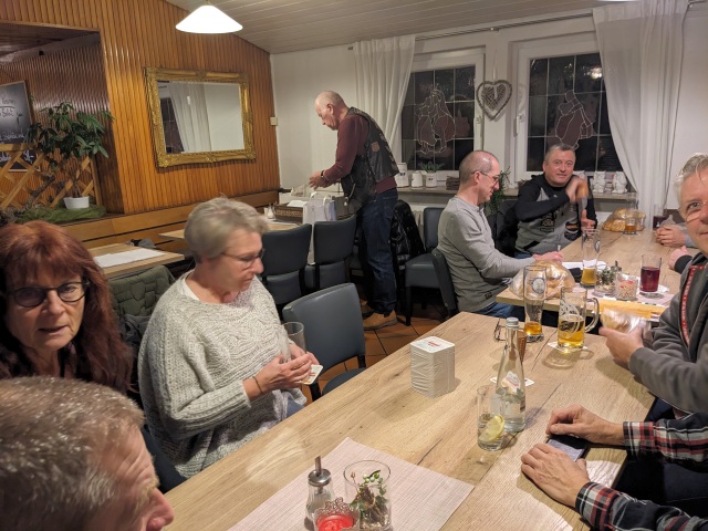 Leider nahmen dieses Jahr weniger Member teil als letztes Jahr - Wetterbedingt? Nobs musste kurzfristig als Organisator fungieren, hatte aber alles gut vorbereitet. Es fehlt an nichts - Würfel, Bierdeckel, die Mutscheln, Lose, gute Laune - alles vorhanden. Aufgrund des Losentscheids wurden drei Gruppen gebildet. Wir verteilten uns auf die Tische und los gings. Vor allem beim "Mäxle" spielte manch einer volles Risiko und versuchte ja nicht rot werden beim schwindeln. Beim Würfeln feuerte man die an, die gerade vorne waren und bedauerte die, die nicht so viel Glück hatten. Jedem Gewinner einer Runde wurde stolz die Mutschel überreicht.