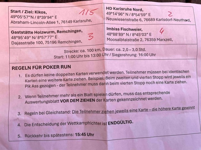 Der Einladung zum Poker-Run beim Fan-City-Chapter Karlsruhe folgten 5 Rula-Member und ein Gastfahrer eines befreundeten Chapters nach Karlsruhe. Nach Eintreffen am Startpunkt, einchecken und Startgeldzahlung, welche übrigens als Spende komplett an ein Kinder-Hospiz geht, wurde die Aufgabe, 3 angegebe Kontrollpunkte anzufahren, voller Elan angegangen. Musste man sich dann doch etwas sputen, weil der zeitliche Rahmen für die Rundfahrt vorgegeben war.