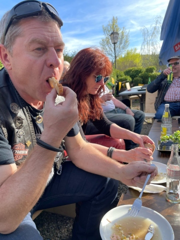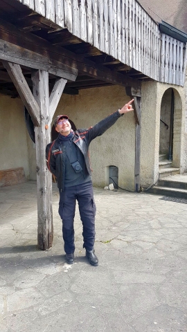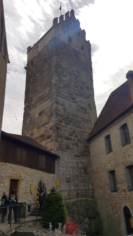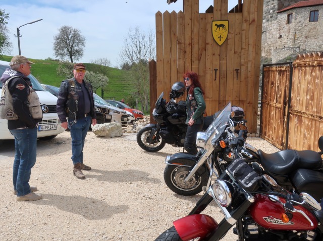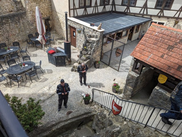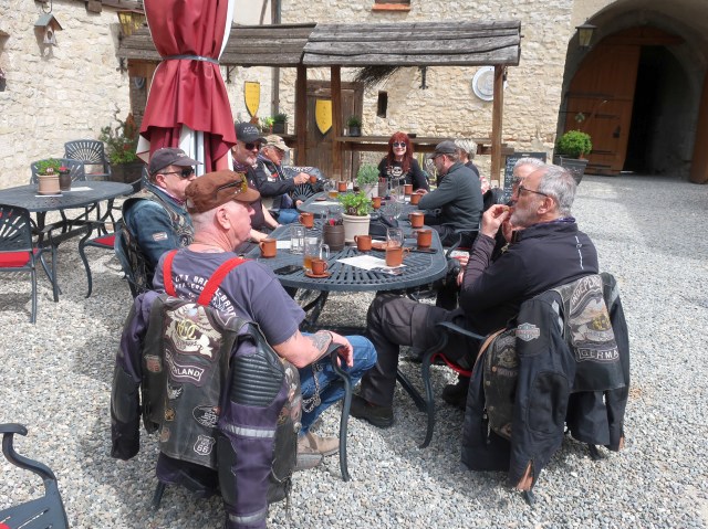 Kaum abgestiegen, kamen die ersten von uns an den Pranger. Nach einer kurzen Besichtigung der sehr gut erhaltenen und renovierten Burg servierte uns eine holde Maid das Mittagessen. Sehr nett war die Kuchenspende des Wirts zum Abschluss unseres Mittagessens.